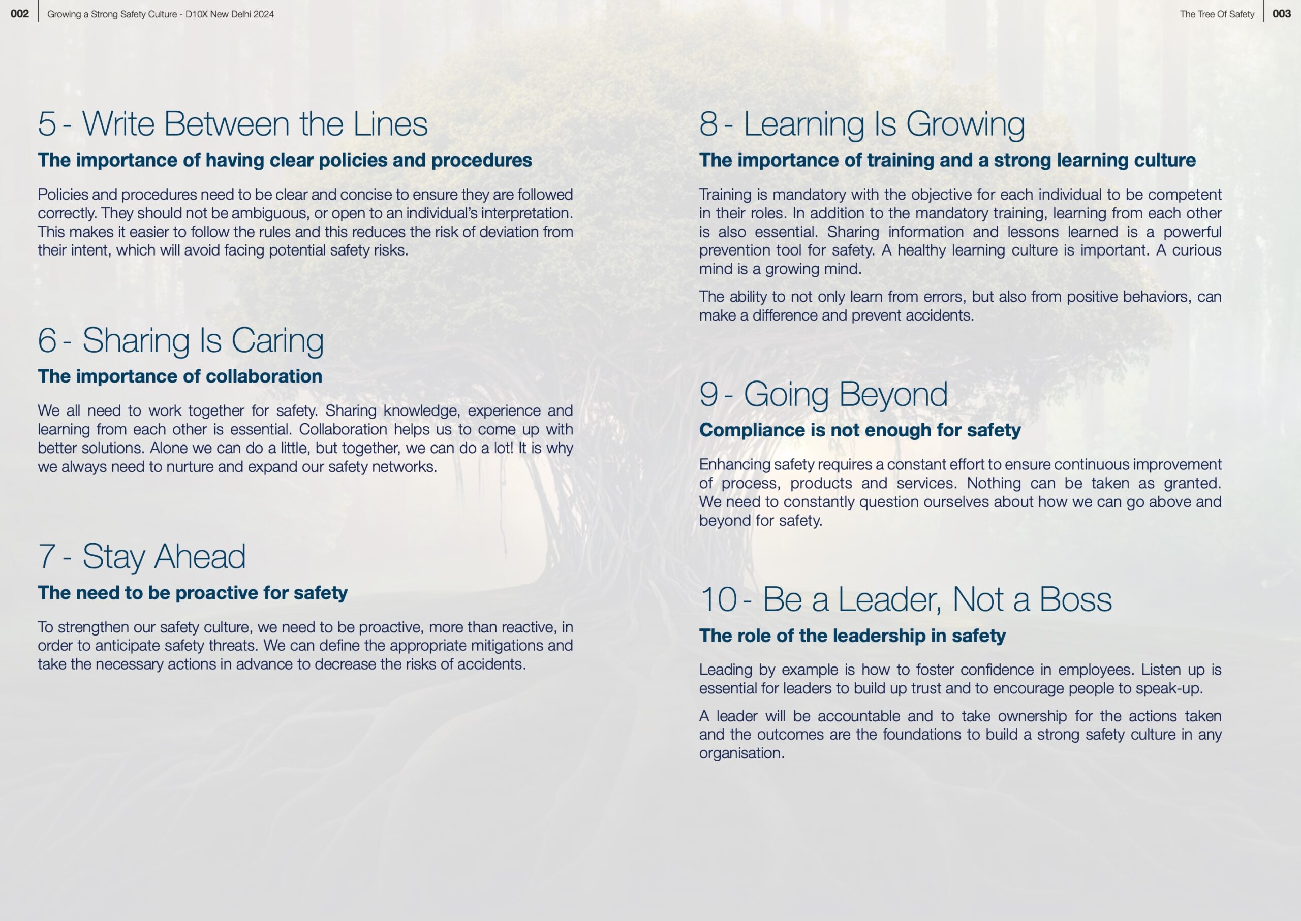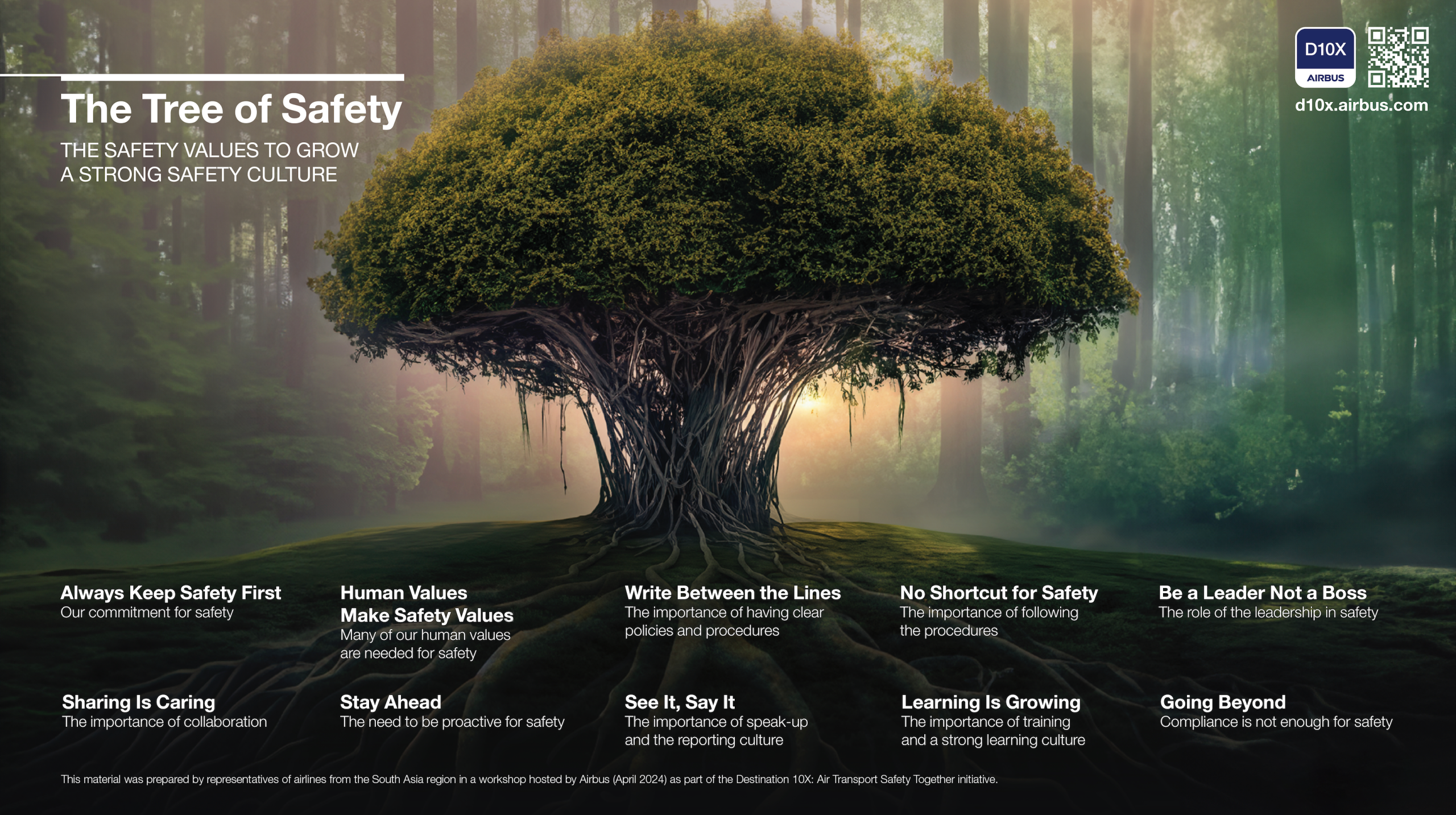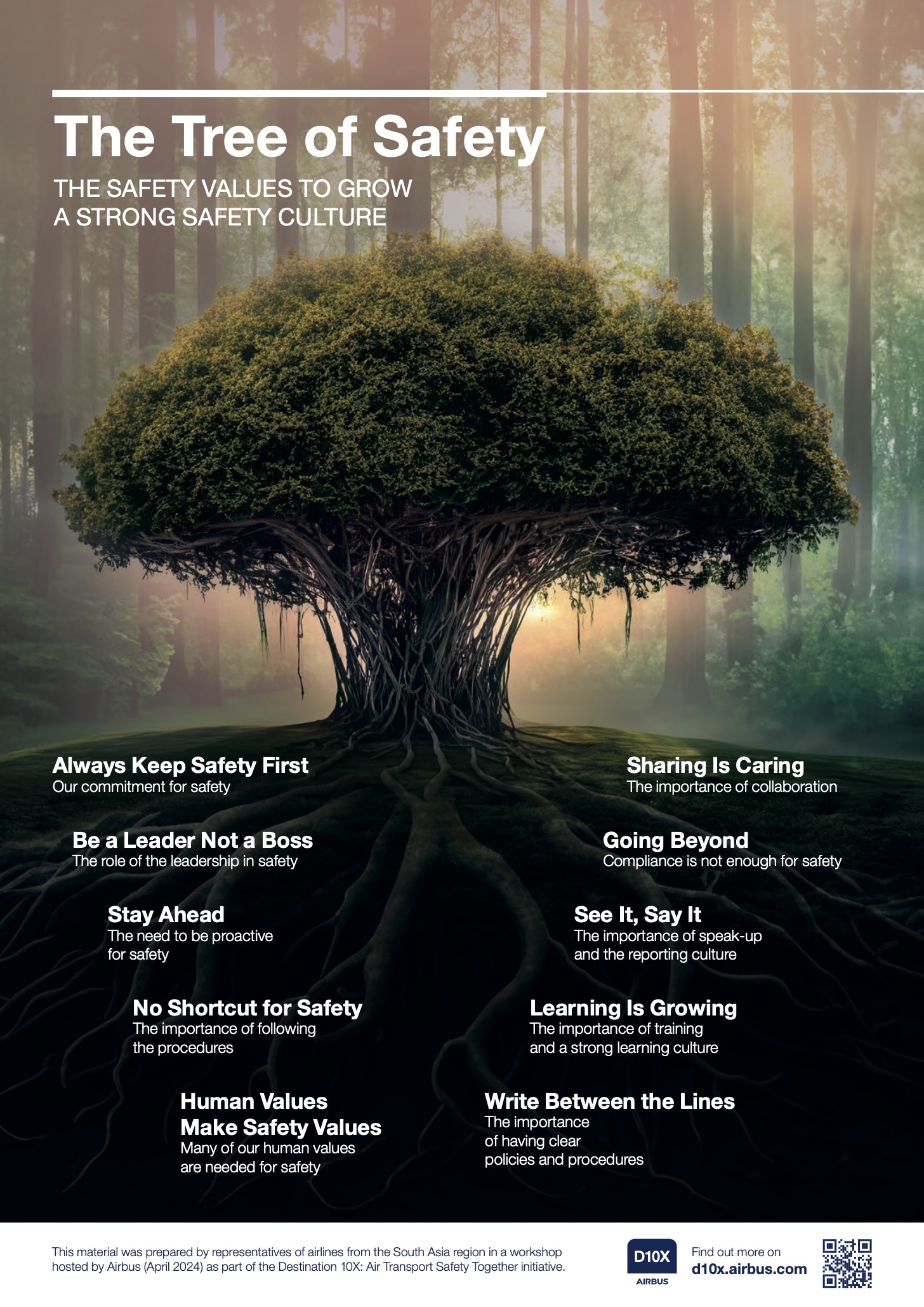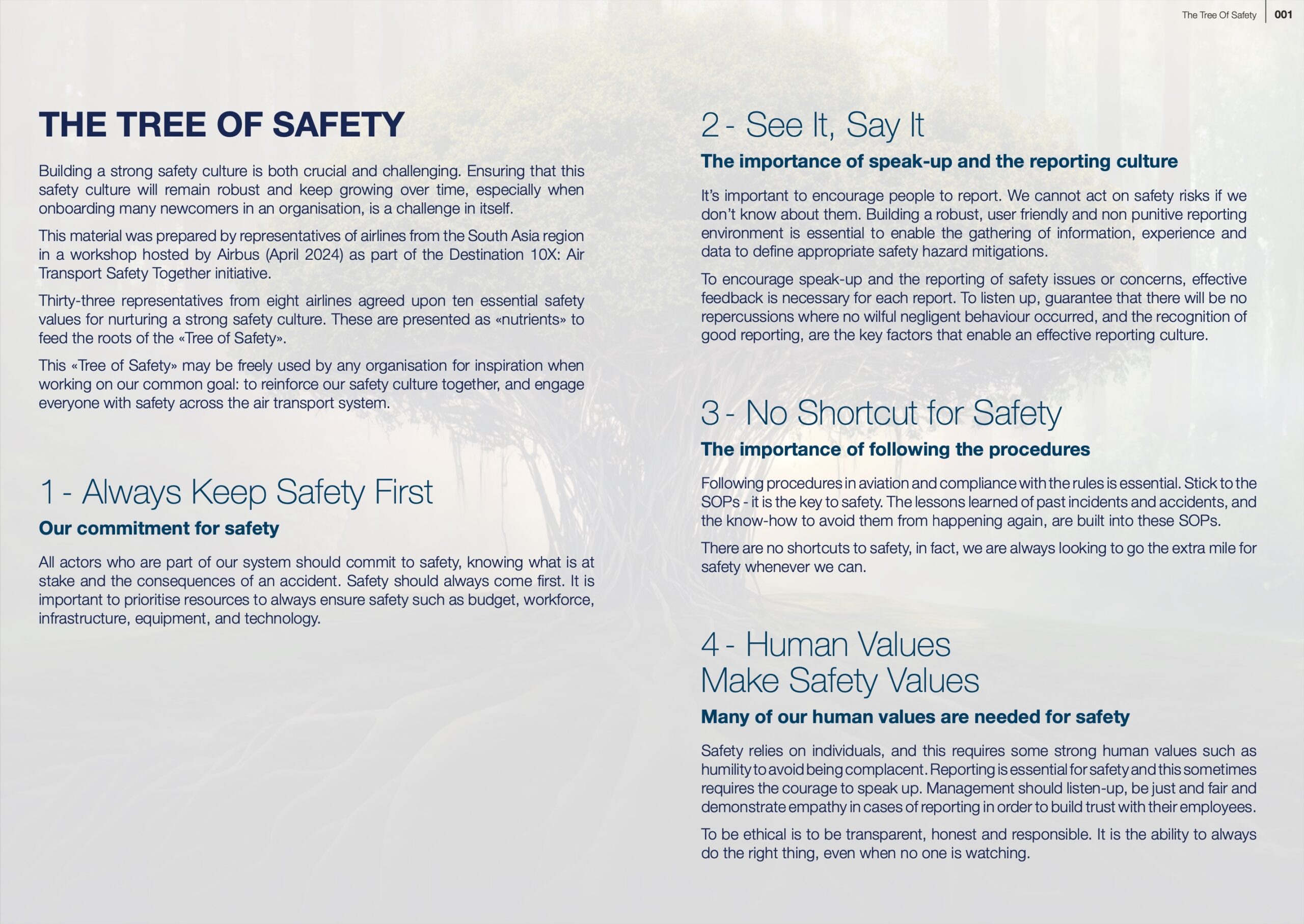 This material was prepared by representatives of airlines from the South Asia region in a workshop hosted by Airbus (April 2024) as part of the Destination10X: Air Transport Safety Together initiative. Thirty-three representatives from eight airlines agreed upon ten essential safety values for nurturing a strong safety culture. These are presented as «nutrients» to feed the roots of the «Tree of Safety».