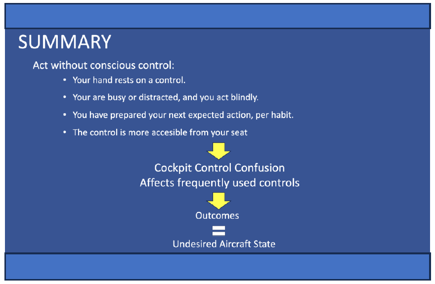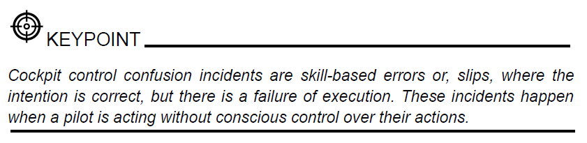 The main challenge in preventing cockpit control confusion is that these errors are not related to a lack of skills or inadequate training. Instead, they stem from the lack of attentional control when performing routine tasks. Conventional training cannot effectively mitigate such slips since these errors are due to cognitive automation that the brain relies on to reduce workload.