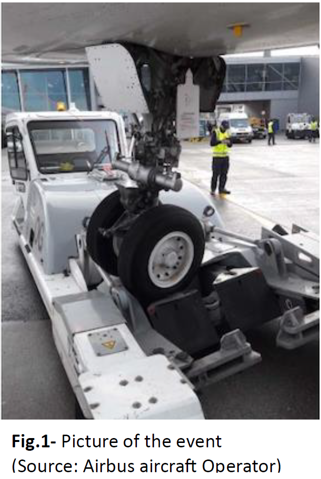The event in question involved an Airbus aircraft during pushback and engine start procedures. The First Officer, acting as Pilot Flying (PF), called the ground crew to initiate pushback and engine start. Following the standard procedure, the PF released the parking brakes. Shortly after the aircraft began moving, the First Officer announced, “starting engine one.” As part of the engine start procedure, the First Officer inadvertently engaged the parking brake handle instead of selecting the Engine Mode (ENG MODE) selector to IGN/START, causing the aircraft to come to an abrupt stop. The sudden halt led to the nose landing gear being dislodged from the tow clamp, causing it to lodge on top of the towbarless pushback vehicle (Fig. 1). This incident resulted in minor injuries to two cabin crew members, who were conducting the safety demonstration at the time. Fortunately, there were no severe injuries among passengers or crew, and all were able to safely disembark the aircraft.