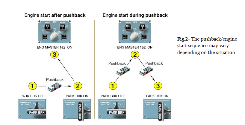 - Setting the PARKING BRK handle to OFF before pushback, then setting the ENG MODE selector to IGN/START to start the engine during pushback, and setting the PARKING BRK handle back to ON when pushback is complete.