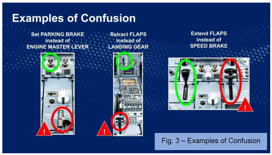 Control confusion often occurs when pilots perform actions on autopilot, relying on muscle memory rather than conscious control. This means that even controls with different shapes and locations can be misinterpreted in high-pressure scenarios or when workload is intense. A documented example of this type of error is the mix-up between the landing gear lever, found on the main instrument panel, and the flaps lever, located on the pedestal (Fig. 3).