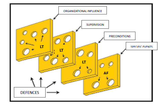 • Active Errors and Latent Conditions: A distinction is made between “Active Failures (AF),” which are unsafe actions committed by people at work, and “Latent Failures (LF),” which are systemic failures that can remain dormant within the system until they contribute to an accident in combination with other factors.